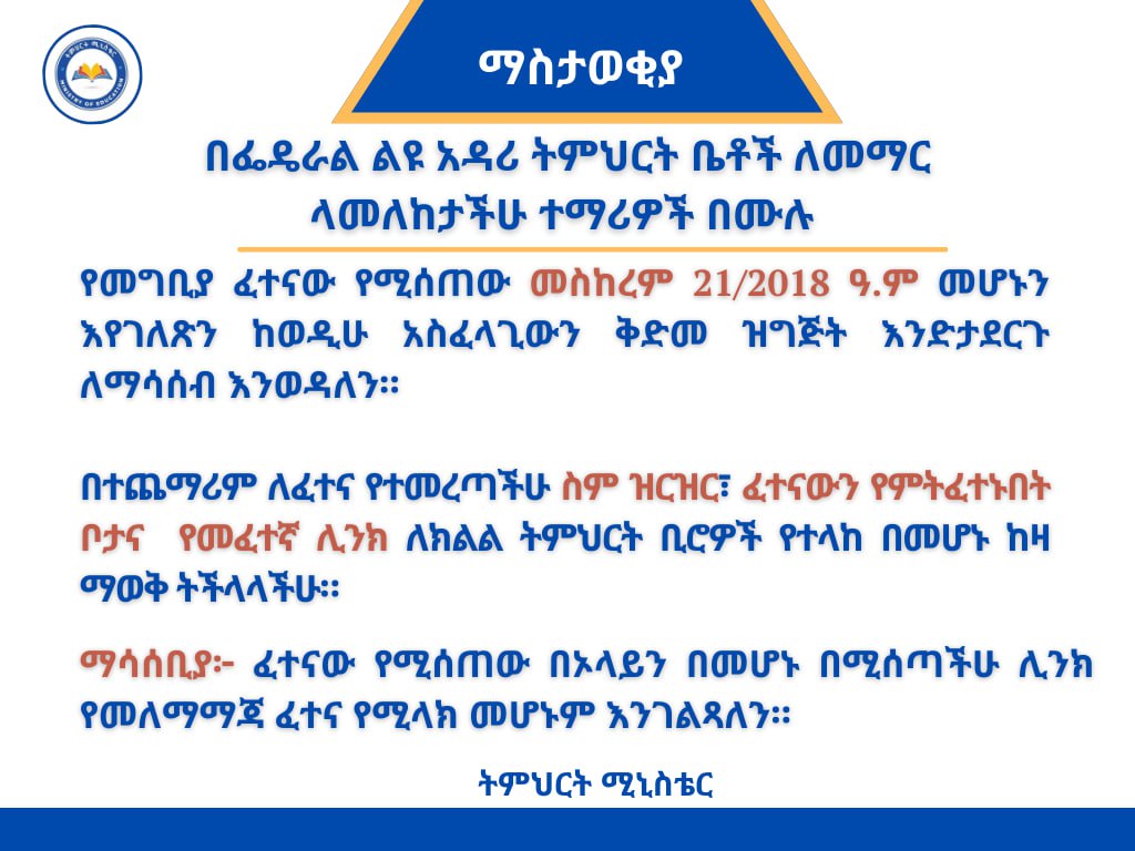 ለፌዴራል ልየ አዳሪ ትምህርት ቤቶች ለመማር ላመለከታችሁ ተማሪዎች በሙሉ