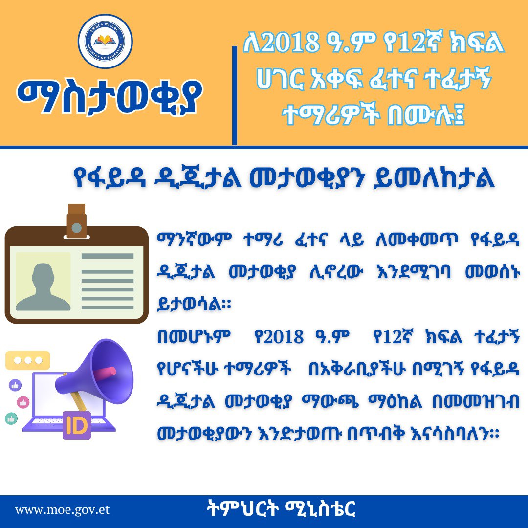 ለ12ኛ ክፍል ተፈታኝ የሆናችሁ ተማሪዎች በሙሉ