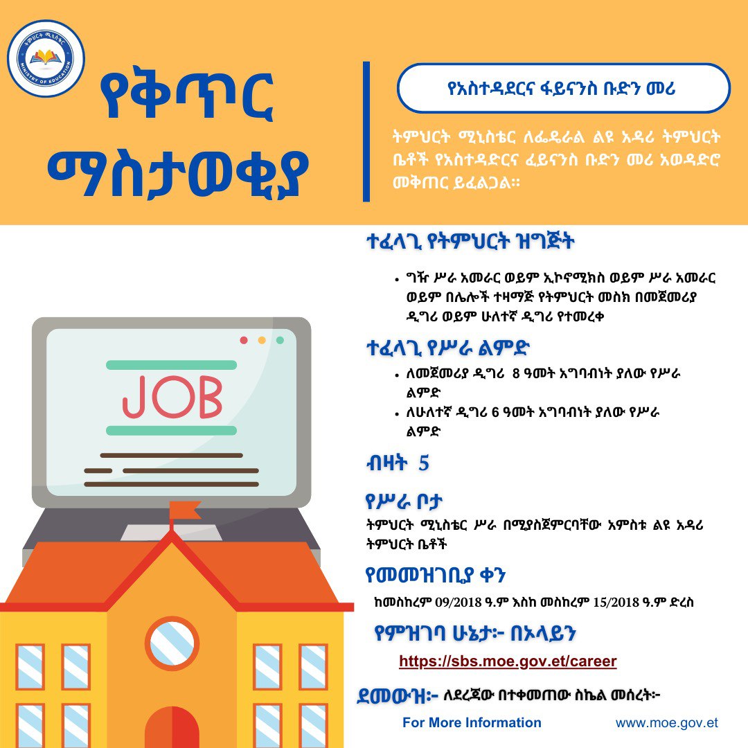 የትምህርት ሚኒስቴር ለፌዴራል ልዩ አዳሪ ት/ቤቶች የአሰተዳደርና ፋይናንስ ቡድን መሪ አወዳድሮ መቅጠር ይፈልጋል። ከላይ በቴምፕሌቱ የተጠቀሱ መስፈርቶችን የምታሟሉ በ https://sbs.moe.gov.et/career በመግባት መመዝገብ የምትችሉ መሆኑን እንገልጻለን።