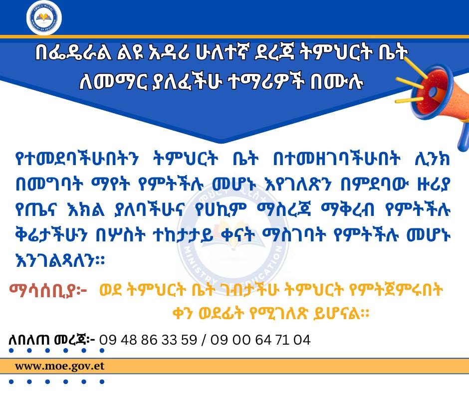 የፌዴራል ልዩ አዳሪ 2ኛ ደረጃ ትምህርት ቤት ለመማር ያለፋችሁ ተማሪዎች በሙሉ