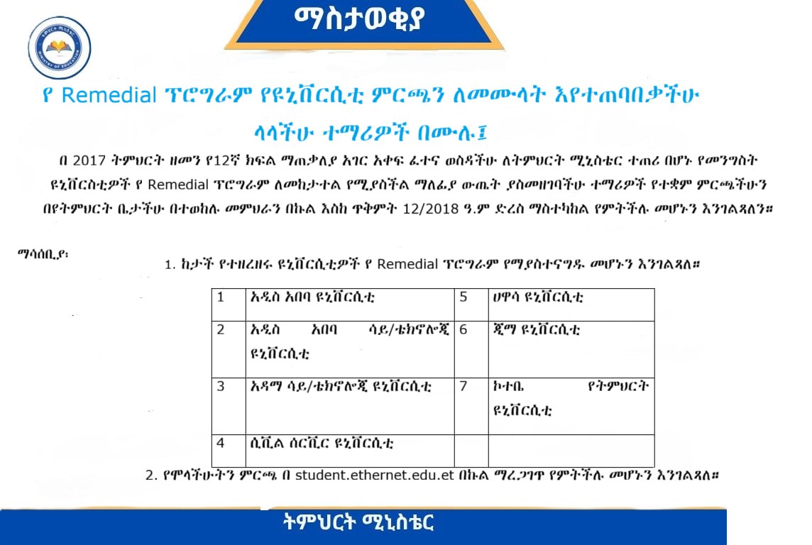 የ Remedial Program የዩኒቨርሲቲ ምርጫን ለመሙላት እየተጠባበቃችሁ ላላችሁ ተማሪዎች በሙሉ