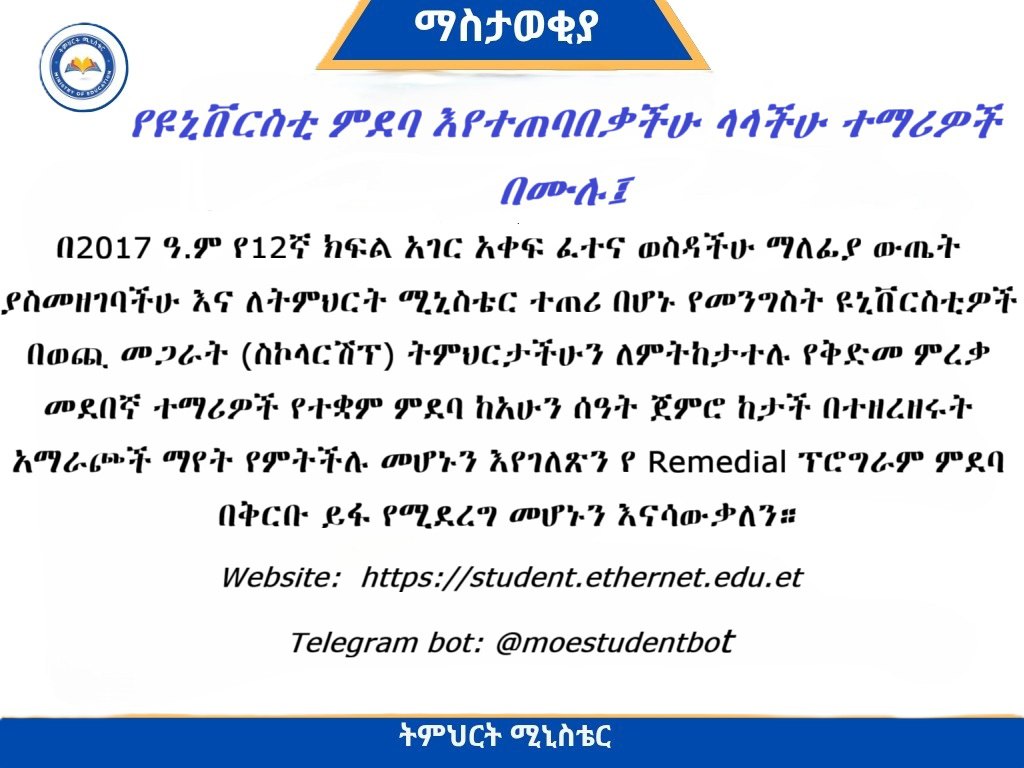 የዩኒቨርስቲ ምደባ እየተጠባበቃችሁ ላላችሁ ተማሪዎች በሙሉ፤